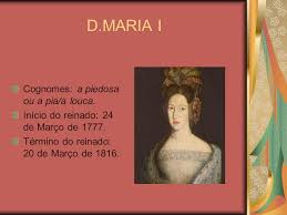 No dia 5 de janeiro de 1785, durante o reinado de Dona Maria I, ... No Brasil, ela ficou conhecida comoDona Maria, a Louca ou Maria Louca por causa da ..."Maria I de Portugal Data de nascimento: 17. Dezembro 1734 Data de falecimento: 20. Março 1816 Maria I , apelidada de "a Piedosa" e "a Louca", foi a Rainha de Portugal e Algarves de 1777 até sua morte, e também Rainha do Brasil a partir do final de 1815. De 1792 até sua morte, seu filho mais velho João atuou como regente do reino em seu nome devido sua doença mental. Era a filha mais velha do rei José I e sua esposa a infanta Mariana Vitória da Espanha."